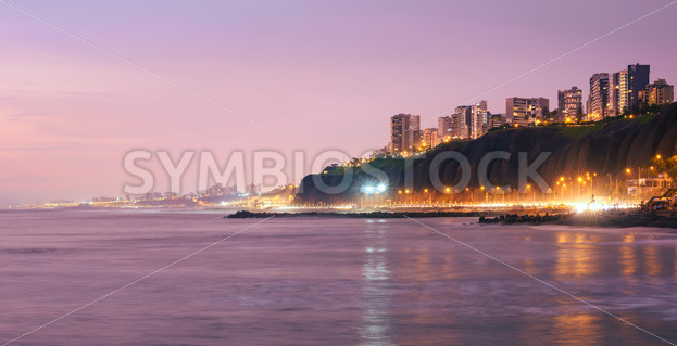 Miraflores Malecon on Pacific ocean coast in Lima city downtown, Peru, South America, in the night