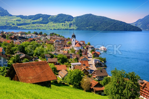 Picturesque landscape with Lake Lucerne and the Alps mountains, Switzerland