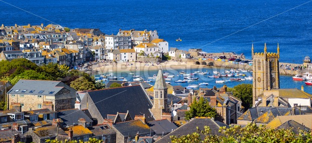 Panoramic view of St Ives Old town, a popular seaside resort on atlantic coast, Cornwall, United Kingdom